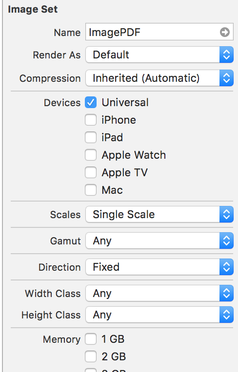 で、Image.Assetsを新規作成して、ScalesをSingle Scaleにして、PDFをドラッグ&ドロップして設定。