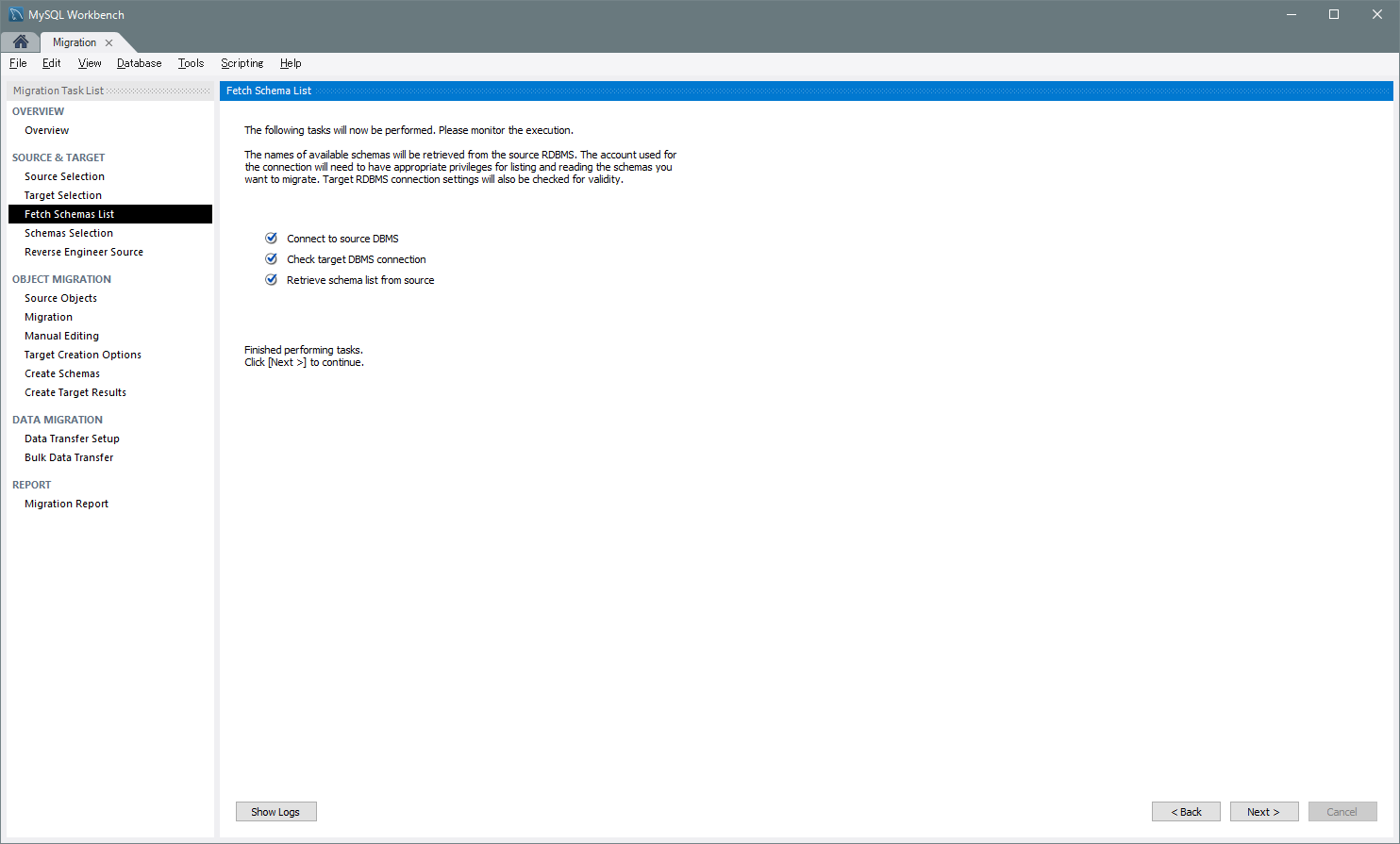 Not retrieving schema list from source when migrating from MSSQL to MySQL using Workbench